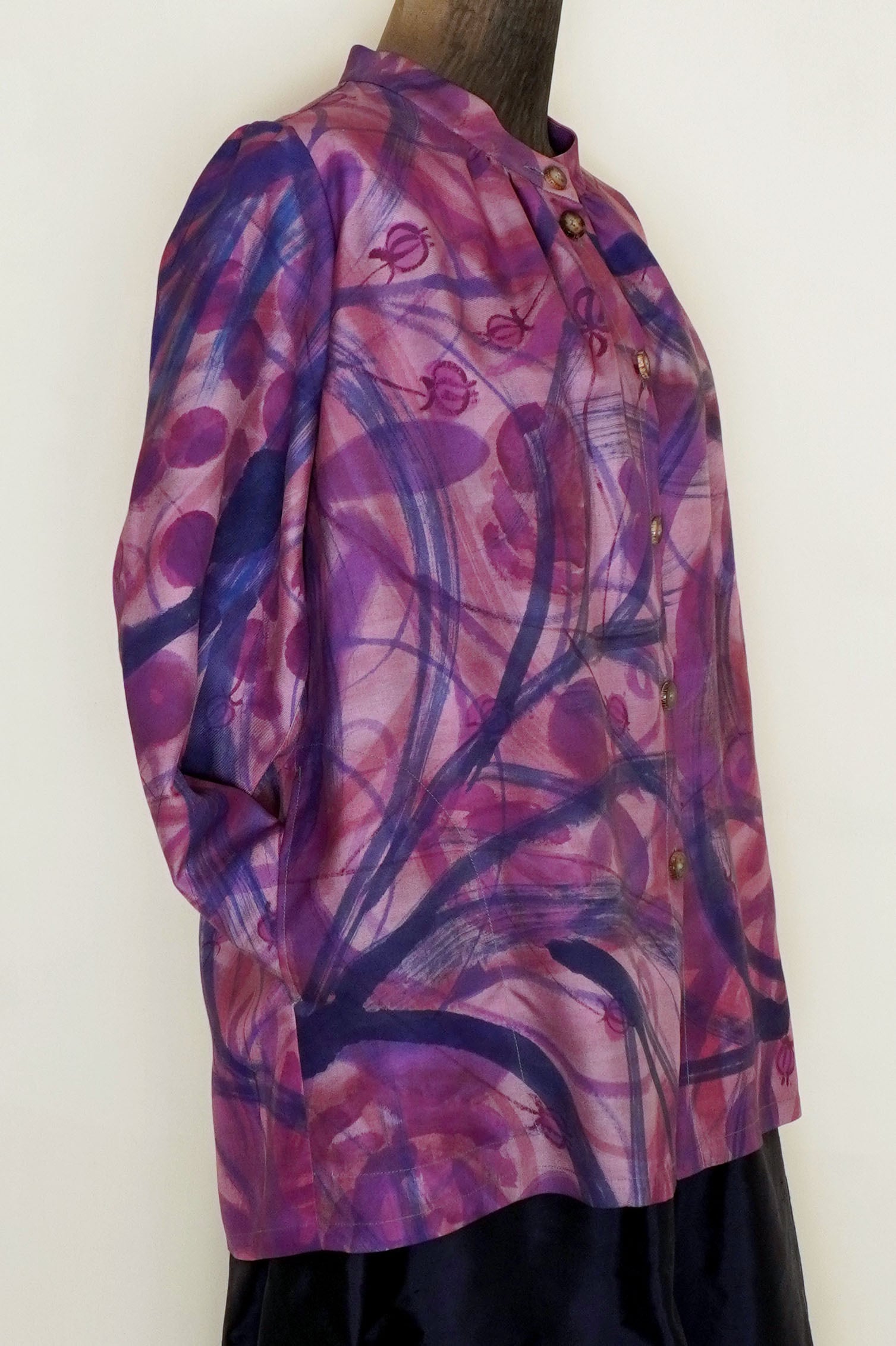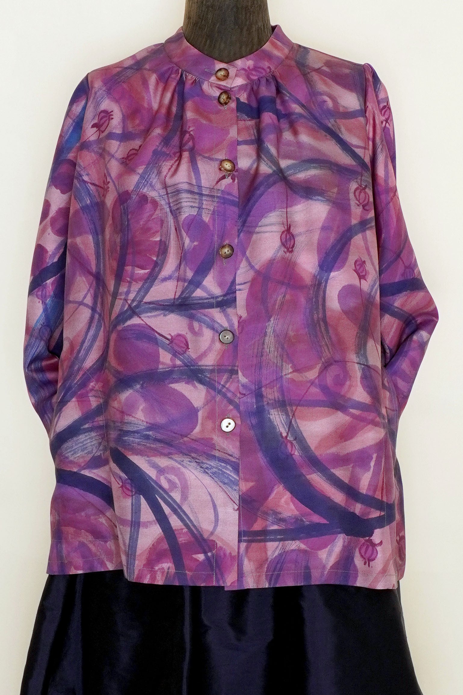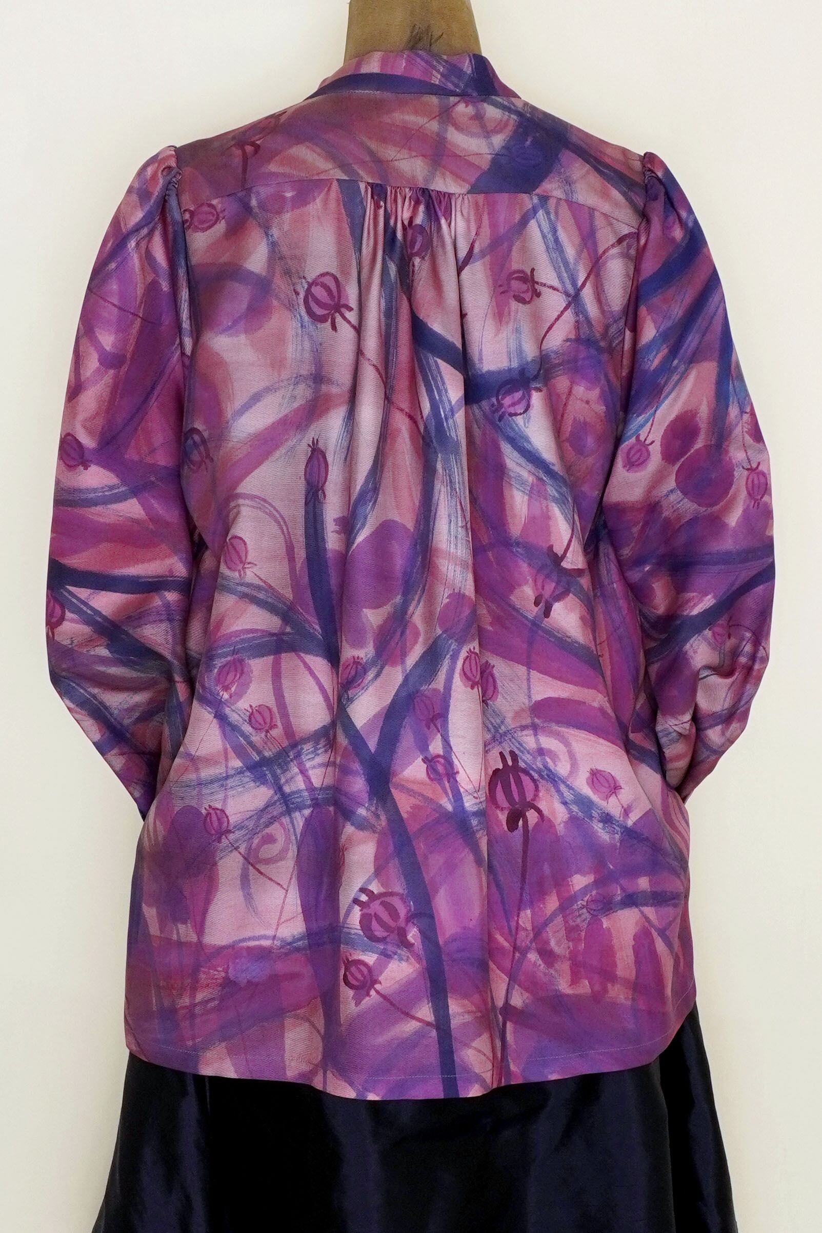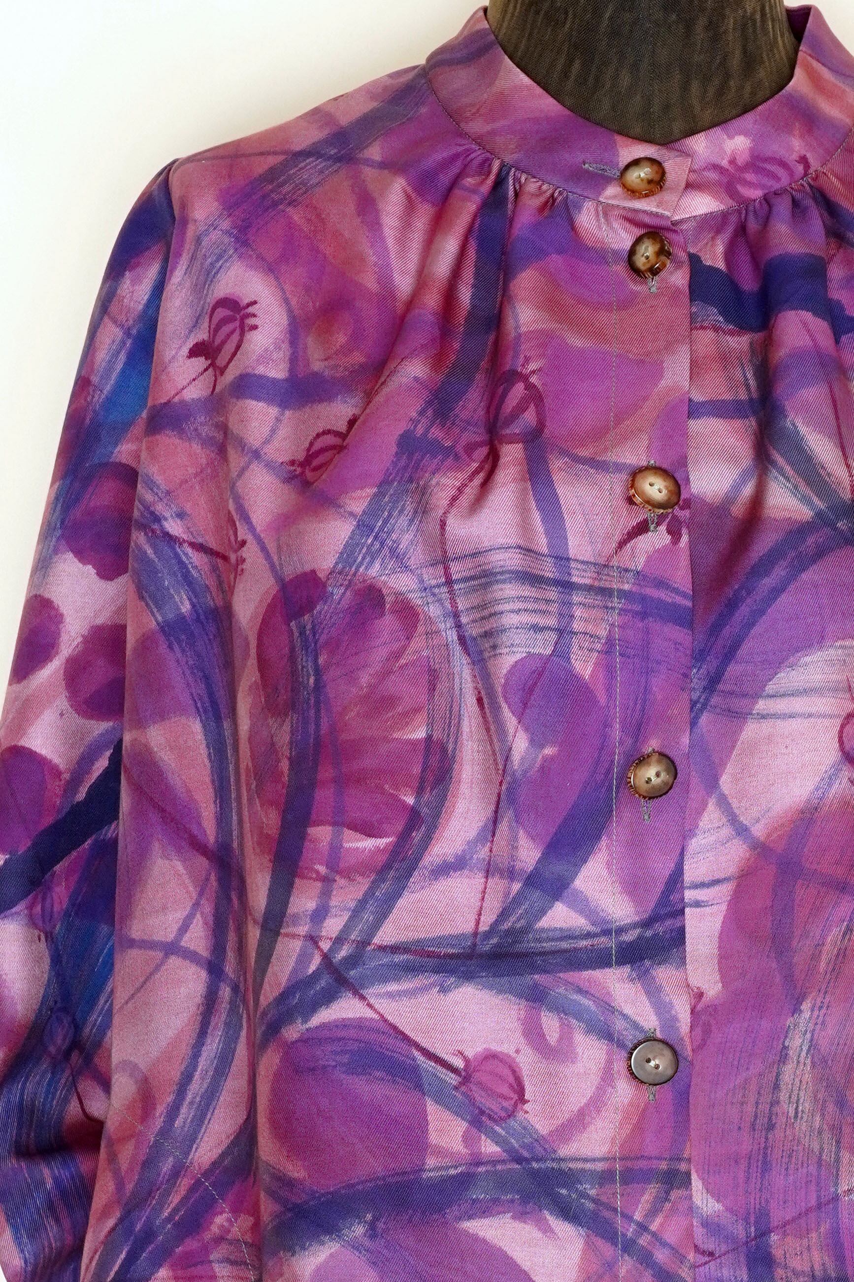 首元から流れるギャザーの美しさは上質なシルクならではのもの。