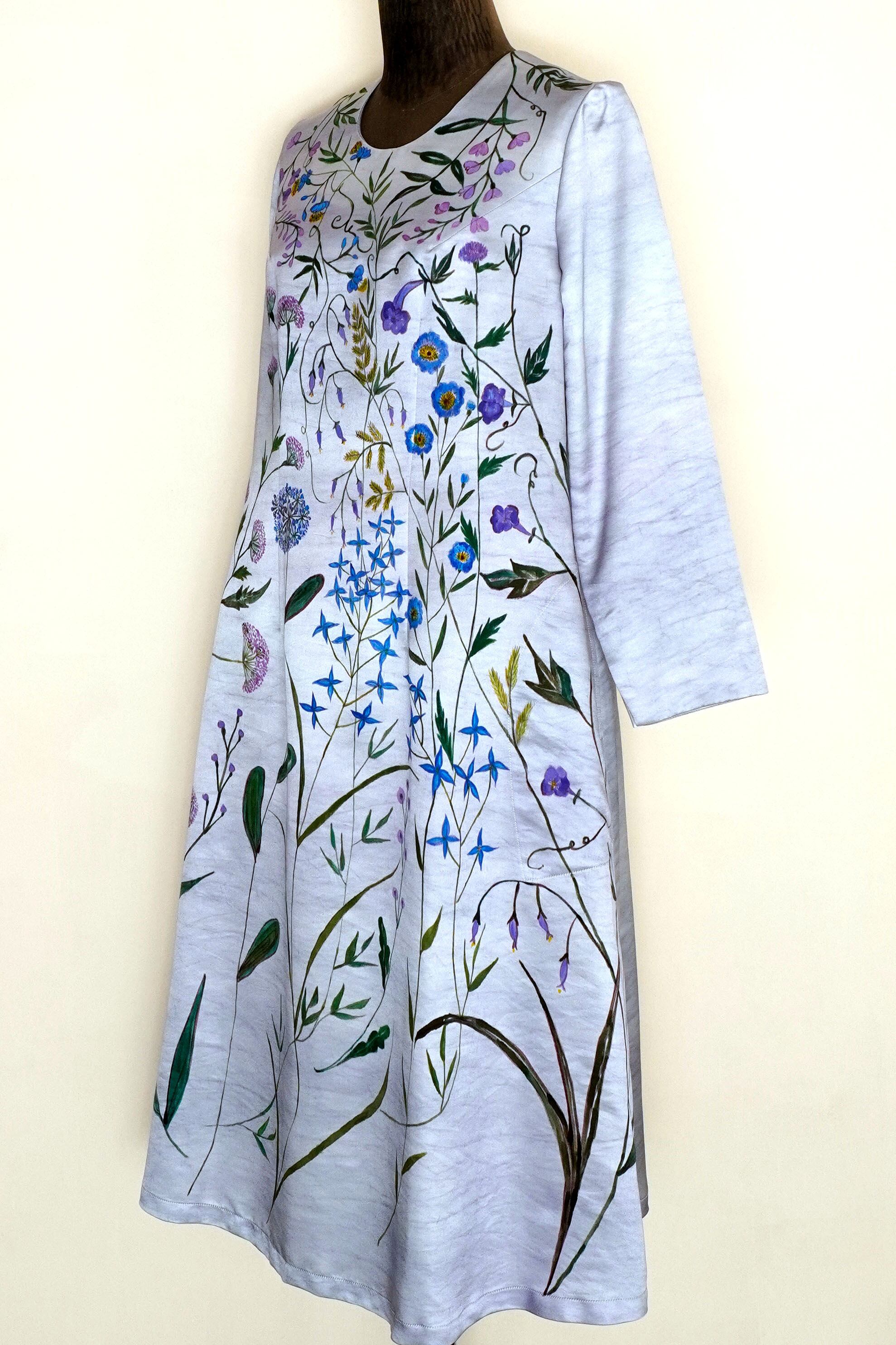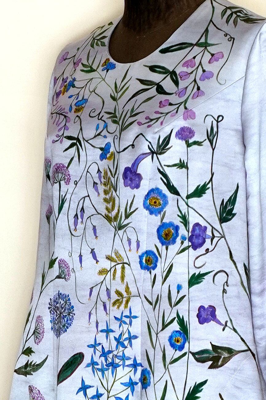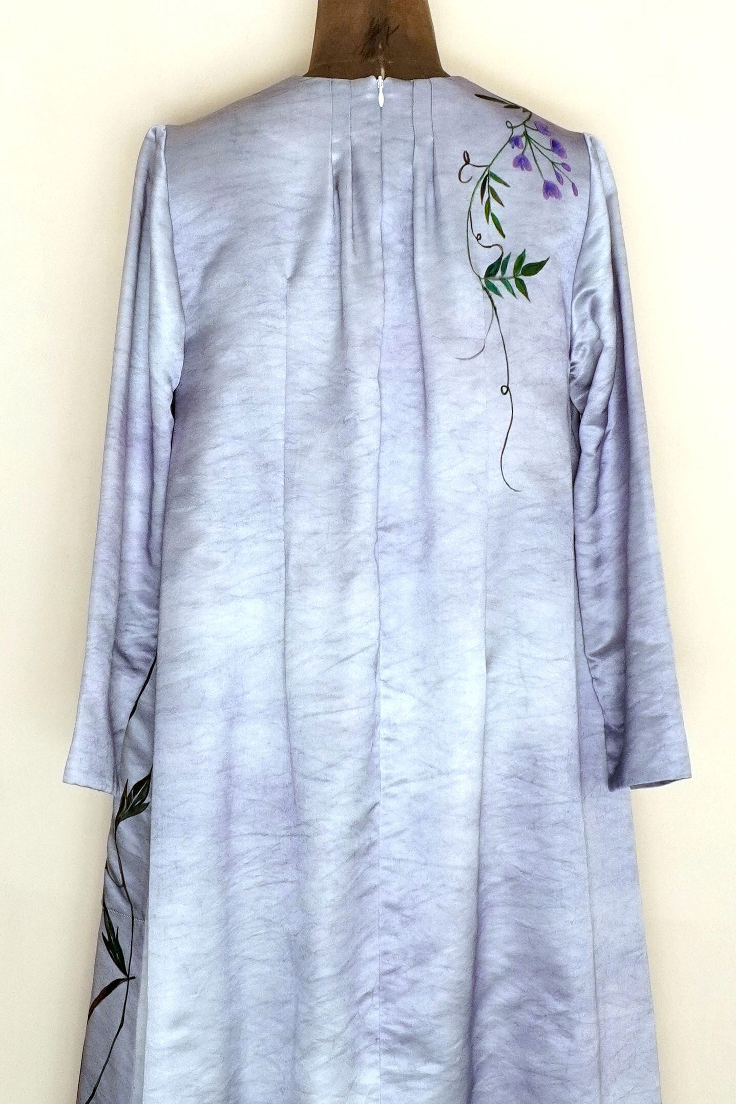 とびきり上質なシルクを錫紫に染め小さき花たちを伸びやかに描きました。フォーマルな場でお楽しみ頂けますと幸いです。