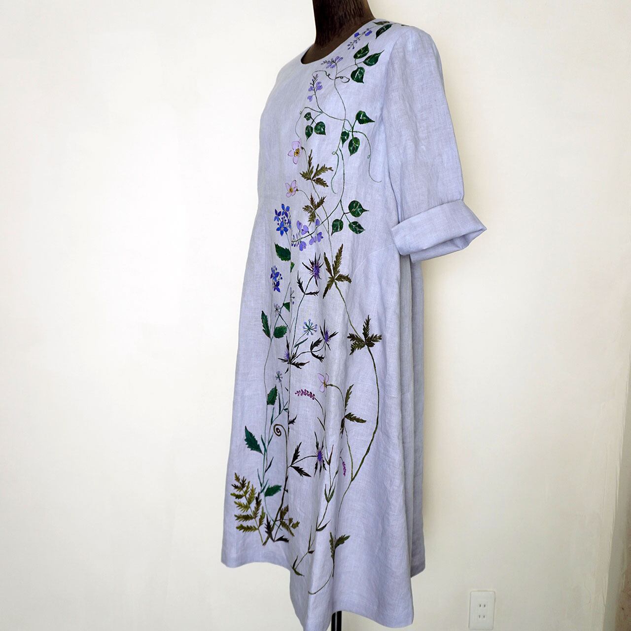 山のぜんまいの周りに揺れる野の花を麻のワンピースに描きました。