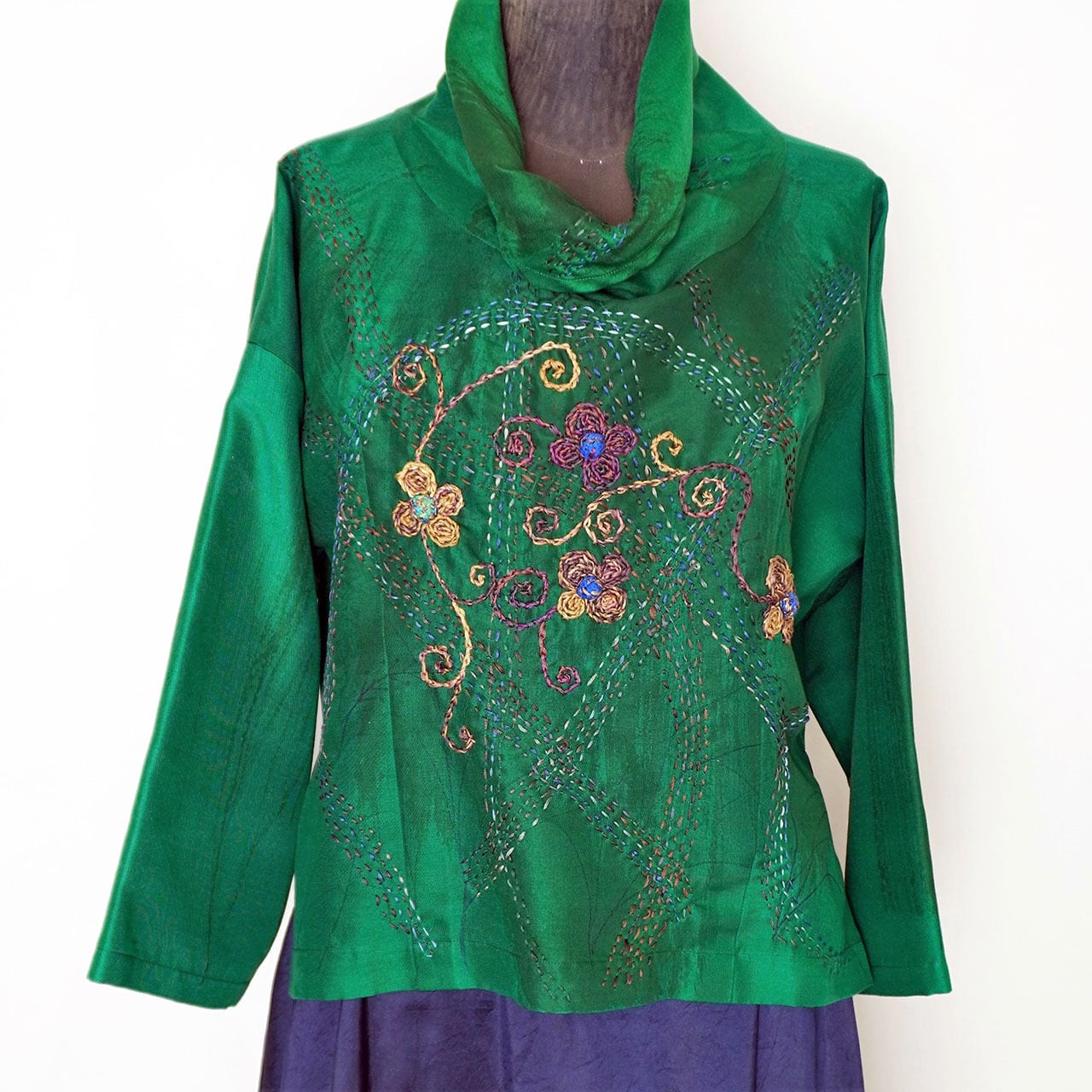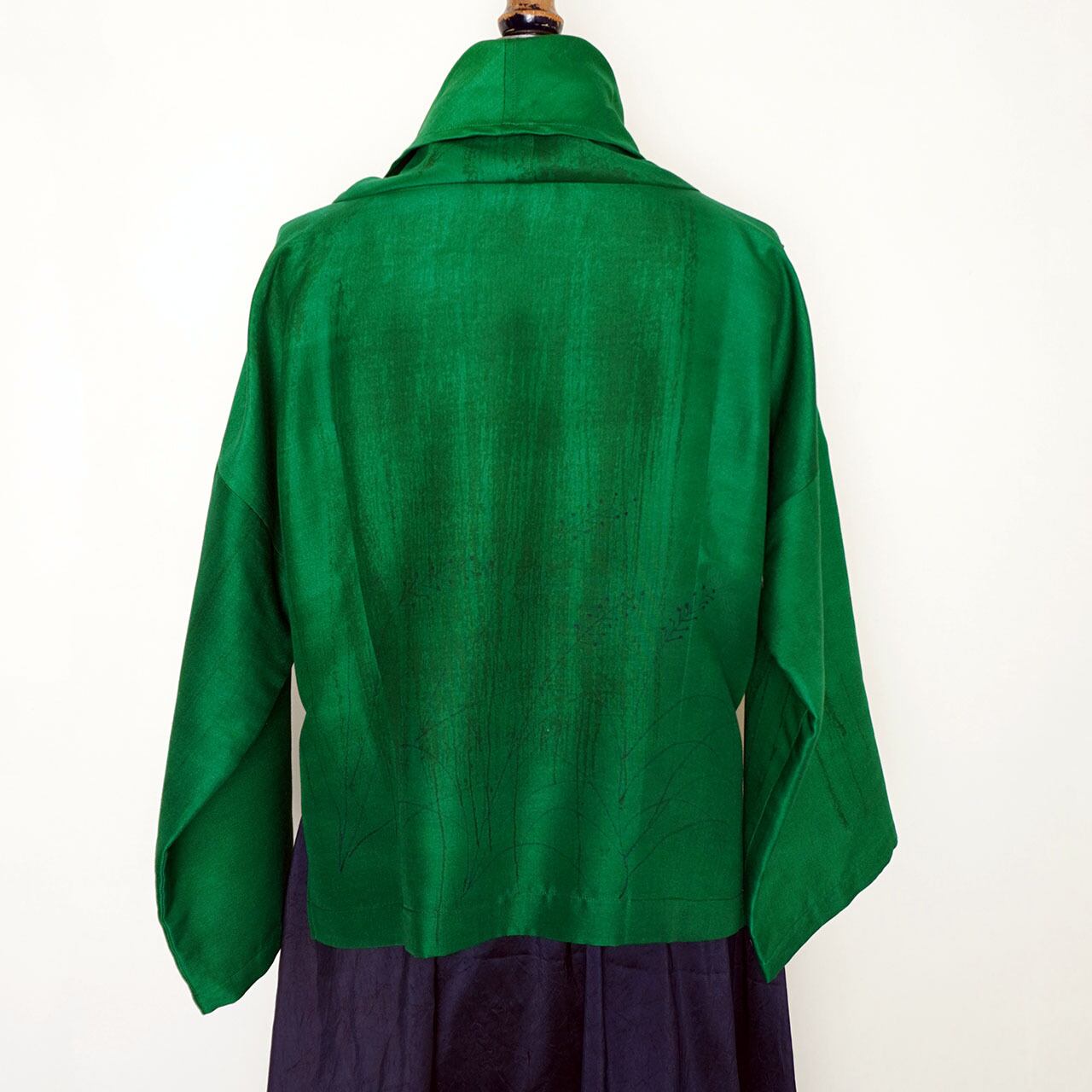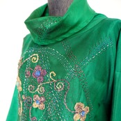 常磐緑にちくちく刺繍したロールカラーブラウス。たっぷりとしたラフなシルエットは 大柄な方も小柄な方も絹を纏う様に楽しくお召し頂けます。